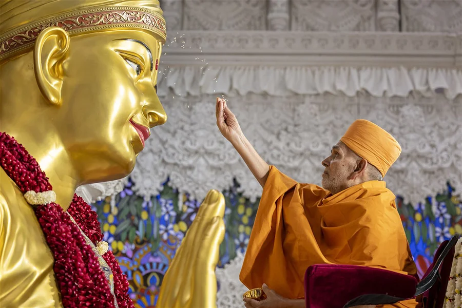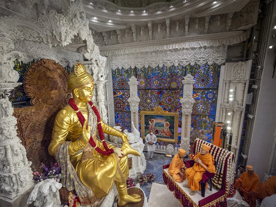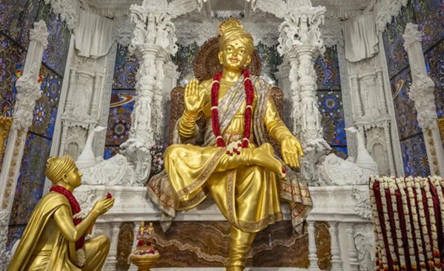 Skulpturene ved Akshardham-tempelet kan beskrives som en «historie om hinduistisk sivilisasjon i stein». Fra den gigantiske statuen av Bhagwan Swaminarayan, en hinduistisk åndelig leder fra 1800-tallet som er innhyllet i hovedhallen, til den 14 meter høye bronsestatuen av Nilkanth Varni ved inngangen til parken, bærer hver statue religiøse fortellinger og kulturelle symboler. For eksempel står statuen av Nilkanth Varni på én fot med sålen opp i en yogastilling, og gjenskaper helgenens 13 000 kilometer lange asketiske reise fra 1792 til 1799, som varte i syv år. Dens dynamiske detaljer og religiøse implikasjoner er evig frosset gjennom kobberteksturen.