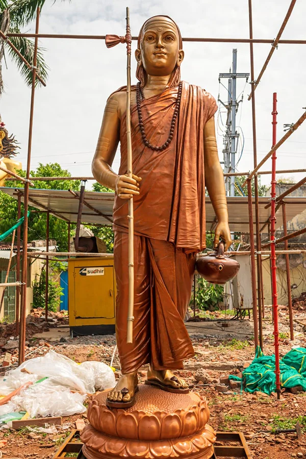 Støpeprosessen til denne 12,5 meter høye og 85 tonn tunge bronsestatuen er et forbilde for moderne metallhåndverk. Tongqing-teamet i Jiangxi-provinsen brukte teknologien «segmentert støping + samlet sveising» for å dekomponere statuen i 37 moduler for separat støping, og oppnådde deretter millimeternivå-dokking gjennom et laserposisjoneringssystem. Blant disse er modellen av Vedanta Sutra som holdes av Shankara bare 3 mm tynn, men mer enn 2000 sanskritskrifter må etses på overflaten. Den uavhengig utviklete «mikroutskjæringsmetoden for elektrolytisk etsing» brøt med hell gjennom den tekniske flaskehalsen.